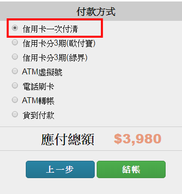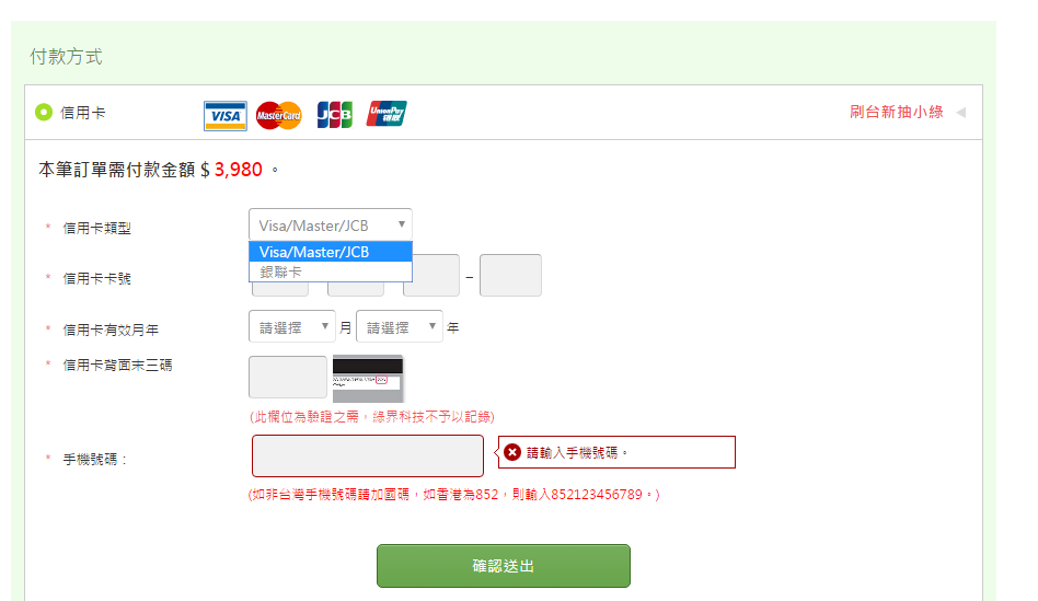 選擇您的信用卡類型,輸入信用卡號、有效年月、末三碼手機號碼